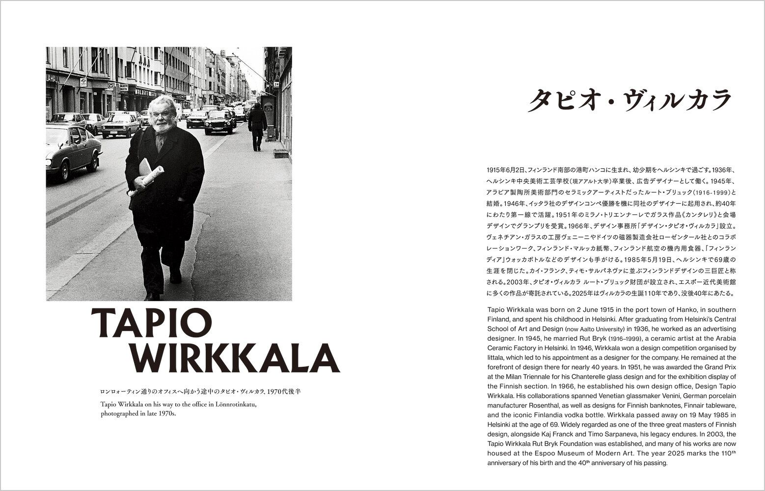 ヴィルカラは、フィンランドのモダンデザイン界で圧倒的な存在感を放つデザイナーです。 1946年、イッタラ社のデザインコンペで優勝。1951年のミラノ・トリエンナーレでガラス作品「カンタレリ」と会場デザインでグランプリを受賞。1960年代からはフィンランド最北端のラップランドで多くの時間を過ごし、生命の神秘や大自然の躍動から得た着想は、代表作の一つ「ウルティマ・ツーレ」を生み出しました。