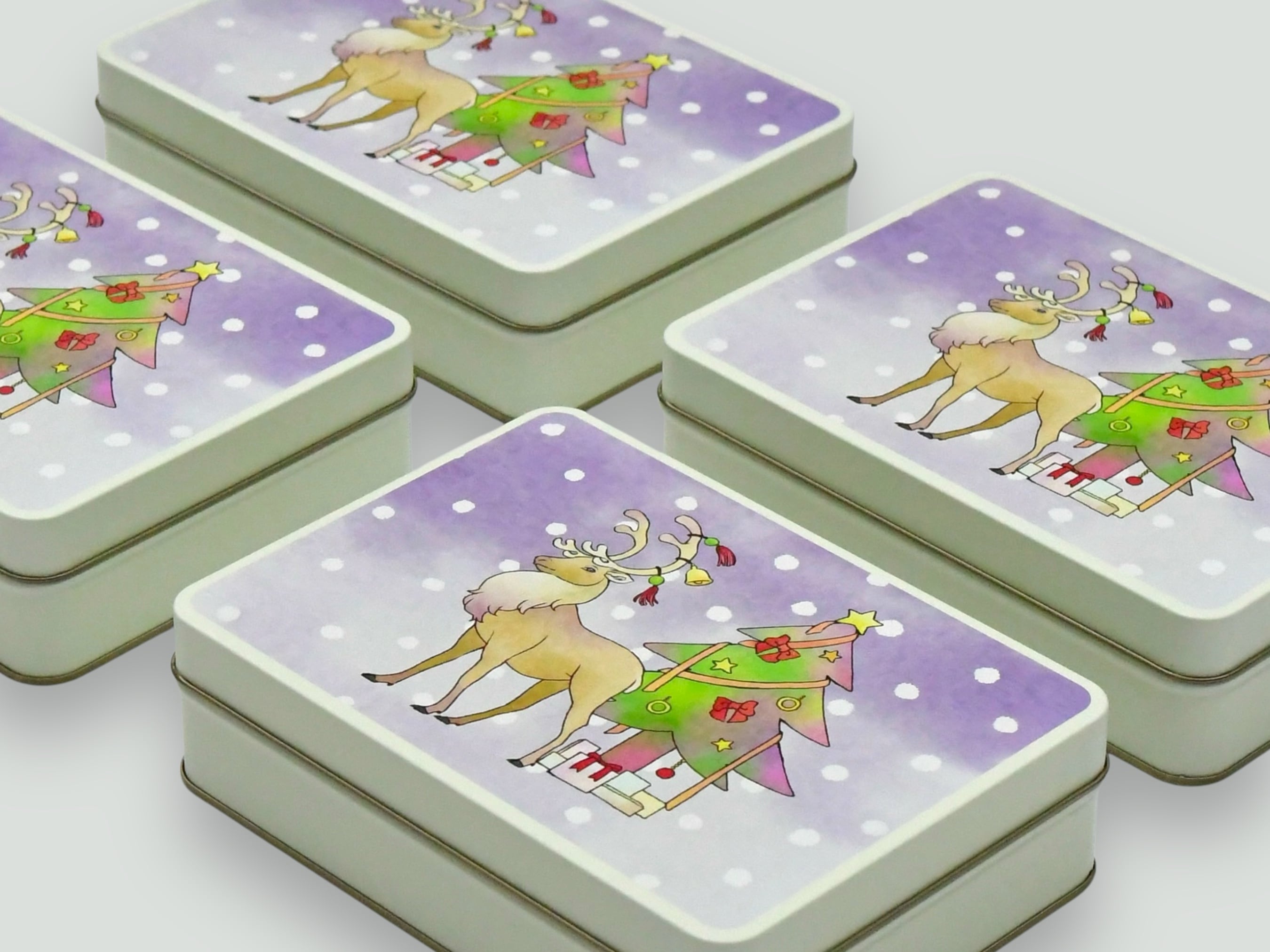 トナカイが描かれたオリジナルクッキー缶に入れてお届け!